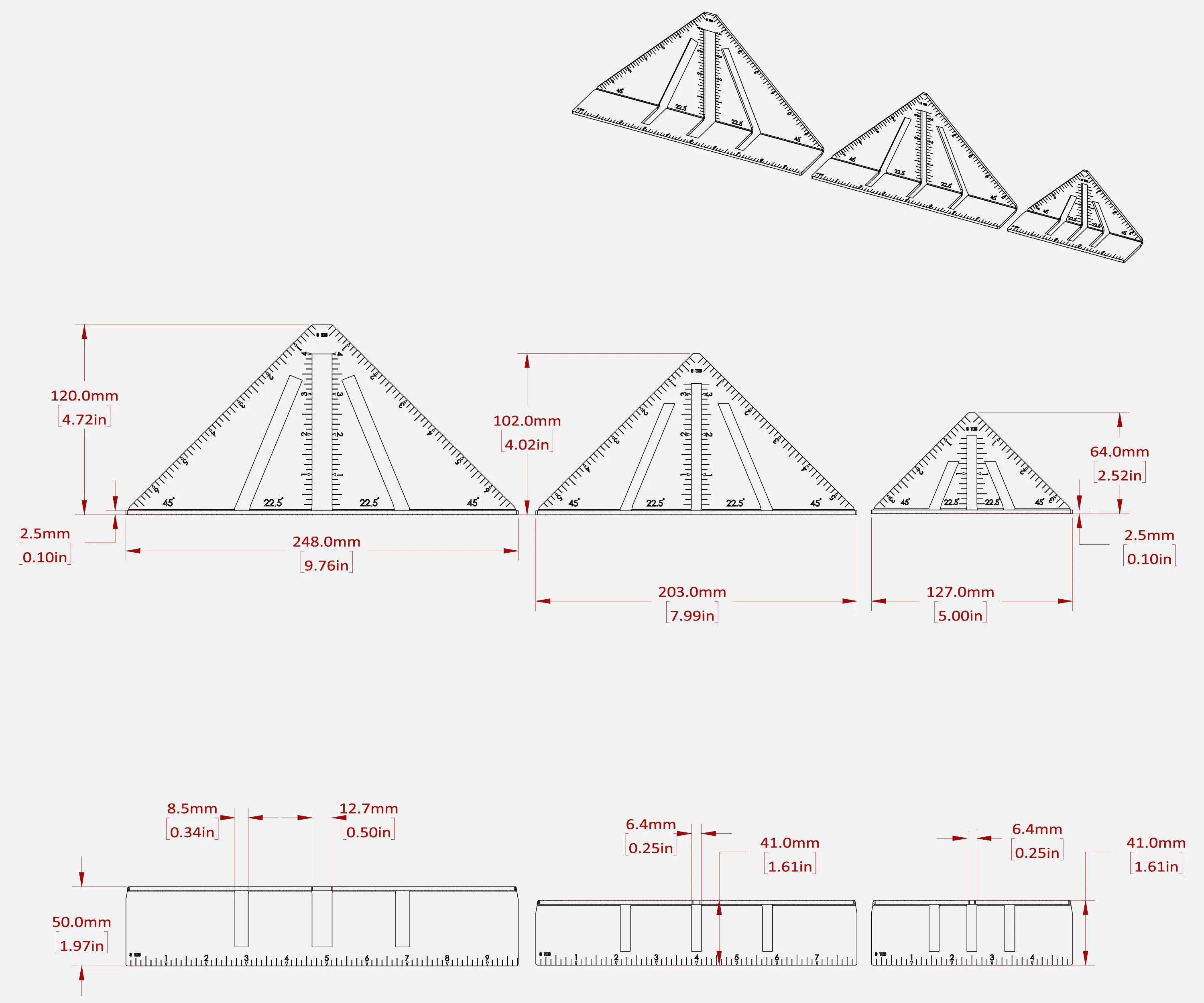 - Laser engraved on both sides of the square for outside or inside measurements in 1/8" increments.